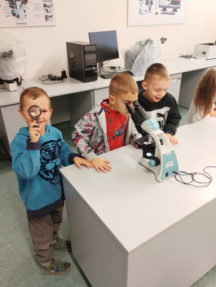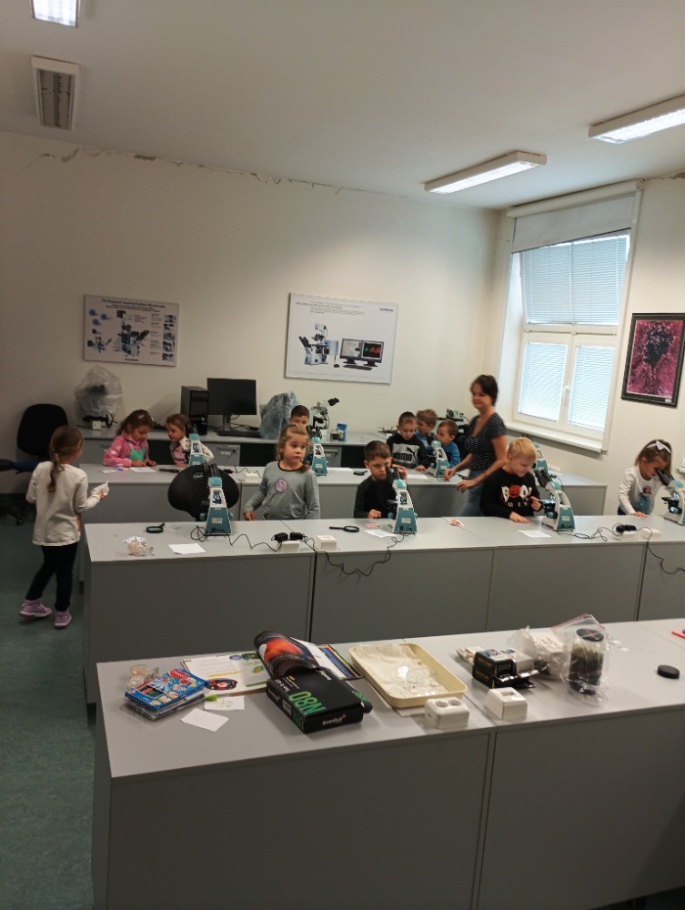 Díky mikroskopům objevovali mikroorganismy, které s námi žijí v našem okolí, a zblízka si prohlédli detaily hmyzu, rostlin i lidských tkání. Seznámili se také se základními laboratorními metodami a naučili se, jak správně zacházet s mikroskopem. Součástí programu byla i tvořivá část – děti zakreslovaly různé tvary a čáry barevnými barvami, které pak společně pozorovaly pod mikroskopem. S nadšením objevovaly, jak se barvy a tvary proměňují při pohledu zblízka.