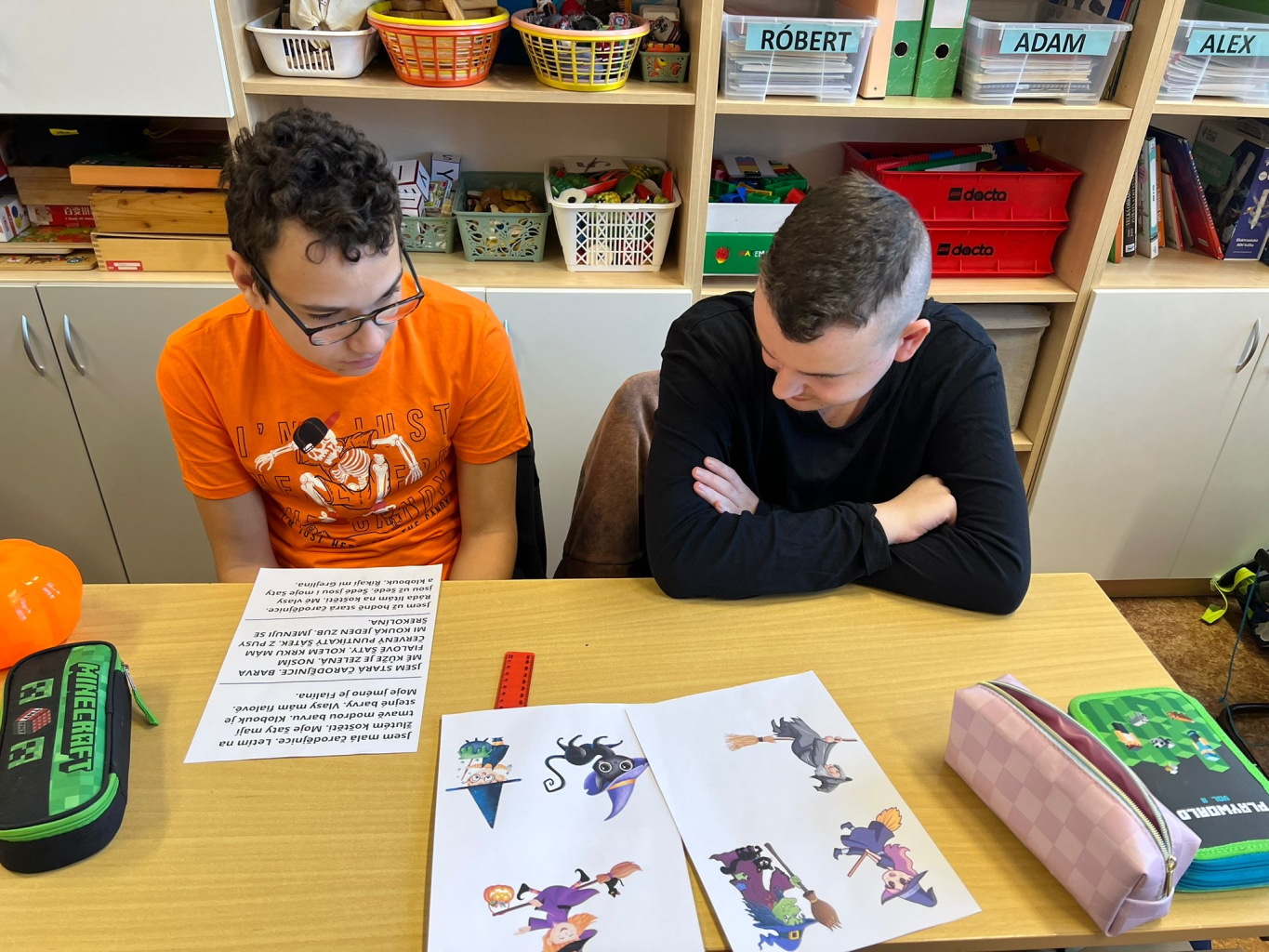 Už od rána to v naší třídě vypadalo jako v říši strašidel, všichni přišli v originálních maskách a panovala skvělá nálada. Připravili jsme si sladké i slané občerstvení, pustili se do halloweenských pracovních listů a potom zamířili do tělocvičny, kde nás čekaly soutěže i tanec. Na závěr jsme si v relaxační místnosti společně zabubnovali. Halloweenský den jsme si všichni moc užili.