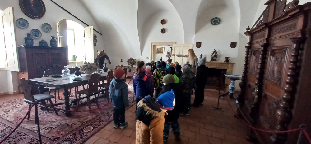 Po náležitém posilnění nás milá paní průvodkyně provedla zámeckými prostory, poutavě přiblížila historii a život na zámku. Děti si se zaujetím prohlížely jednotlivé místnosti, sklepení, kapli a pozorně naslouchaly vyprávění paní průvodkyně. A protože správný zámek se neobejde bez tajemství, nechyběla ani zde pověst o zlém duchovi někdejšího pána zámku. Velkou pozornost vzbudil i hodný medvěd, který sice již není živý, ale stále „bydlí“ na zámku a patří mu zde stálé místo.