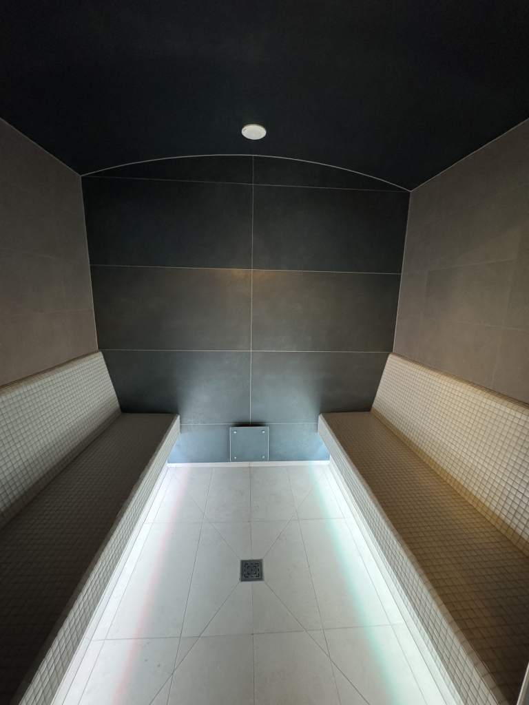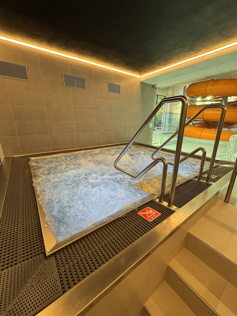 V bazénové části jsou kompletně nové sprchy a toalety, které odpovídají nejpřísnějším hygienickým standardům. Po přestavbě prostoru po bývalé vířivce vzniklo zázemí pro moderní nerezovou whirlpool vanu s barevným podsvícením a kapacitou až sedm osob.