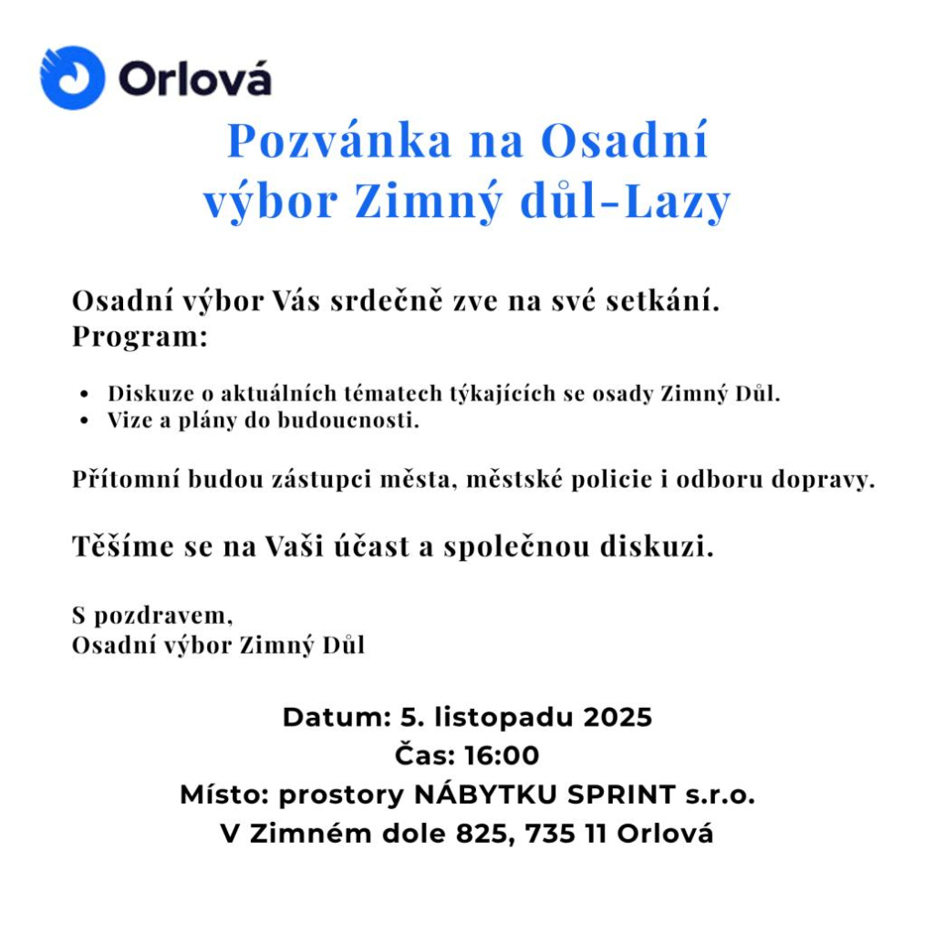 Osadní výbor Zimný důl-Lazy zve veřejnost na společné setkání, které se uskuteční ve středu 5. listopadu 2025 v 16 hodin v prostorách Nábytku Sprint na adrese V Zimném dole 825, 735 11 Orlová-Město.