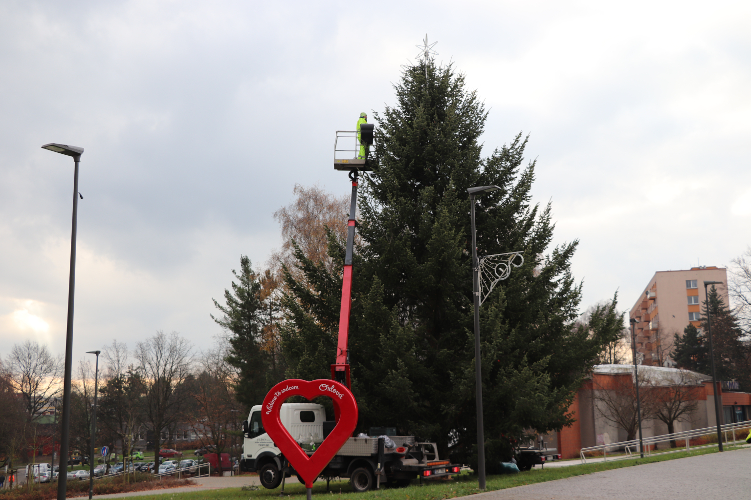 Od dnešních dopoledních hodin probíhá zdobení vánočního stromečku na náměstí 28. října v Orlové-Lutyni. Současně firma instaluje také vánočního osvětlení po celém městě. Vše by mělo být hotovo do konce listopadu.