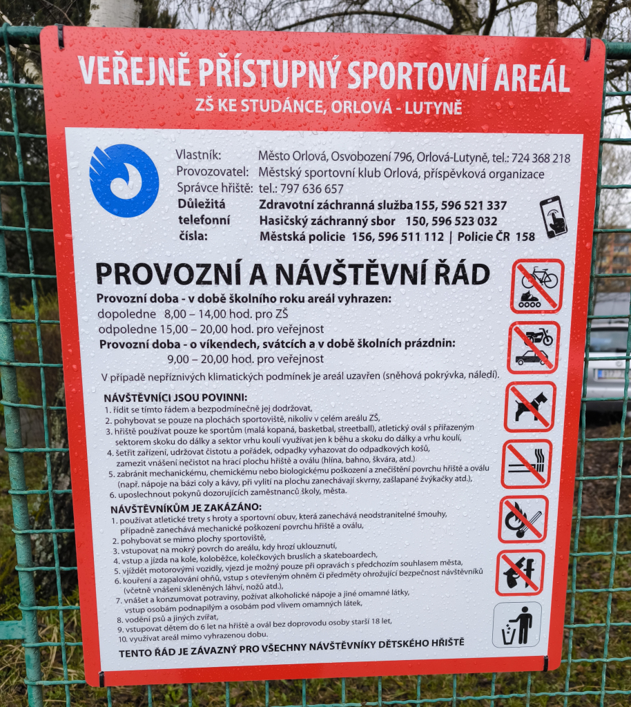 - používat pouze ke sportům (malá kopaná, basketbal, streetball), atletický ovál s přiřazeným sektorem skoku do dálky a sektor vrhu koulí využívat jen k běhu a skoku do dálky a vrhu koulí