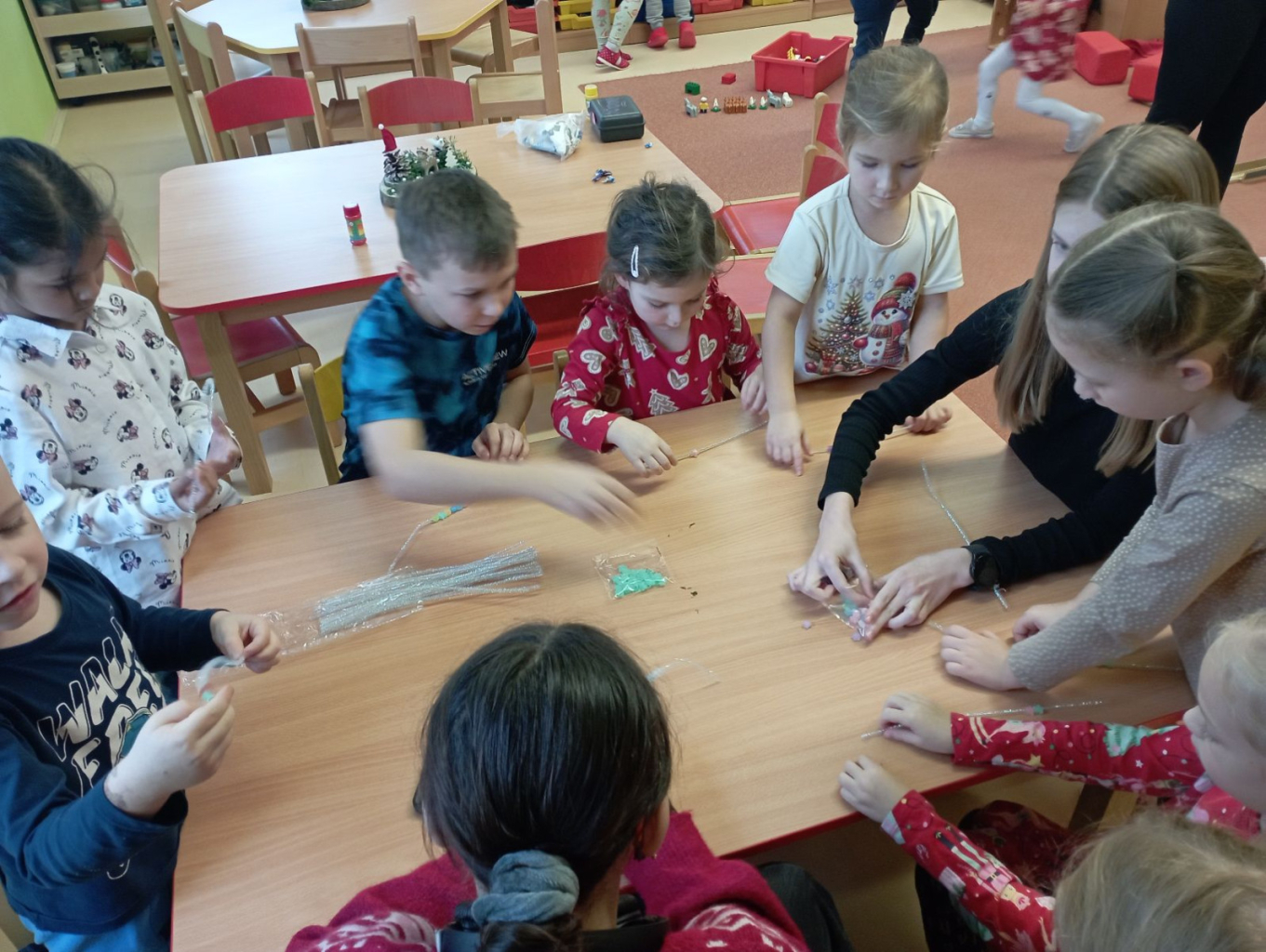 Po společném zpívání se děti rozdělily do skupinek, aby se pustily do Mikulášského tvoření. Mladší děti s radostí tvořily po boku starších žáků, kteří jim ochotně pomáhali. Vznikaly tak krásné vánoční ozdoby, které si děti s nadšením odnesly domů.