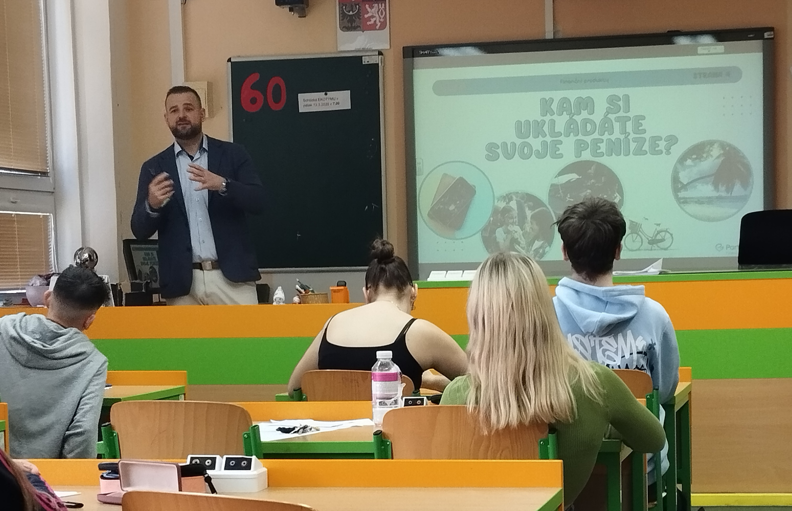 Ve své prezentaci žákům přiblížil, jak by měli v budoucnu přistupovat k hospodaření se svými penězi. Společně diskutovali také o tom, od koho je vhodné si nechat poradit, a důležitou součástí bylo i vysvětlení, jak si efektivně rozdělit příjem a vytvářet finanční rezervy.