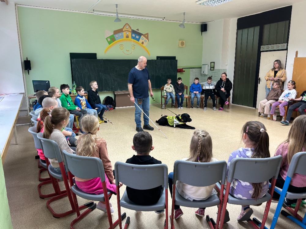 Na naší škole se uskutečnila velmi zajímavá a poučná přednáška o vodicích psech, která byla určena pro všechny třídy prvního stupně. Přednášku vedl pan Holba, který nám poutavým způsobem přiblížil svět nevidomých lidí a jejich čtyřnohých pomocníků. Během setkání jsme se dozvěděli mnoho nového o výcviku vodicího psa.