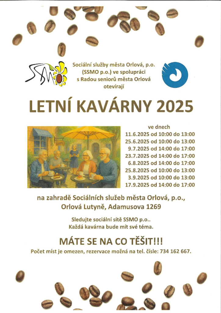Sociální služby města Orlové i letos připravily pro veřejnost oblíbenou sérii letních kaváren, které se konají na zahradě zařízení v Orlové-Lutyni. O obsluhu návštěvníků se tradičně starají klienti chráněného bydlení společně se sociálními pracovníky. Ani nepříznivé počasí akci neohrozí, v případě deště se kavárna jednoduše přesune do vnitřních prostor.