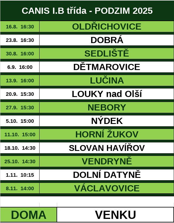 Domácí utkání hraje FK Baník Orlová 1927 každou lichou sobotu až do 8. listopadu 2025. Každou sudou sobotu do 1. listopadu vyjíždí na trávník soupeře.