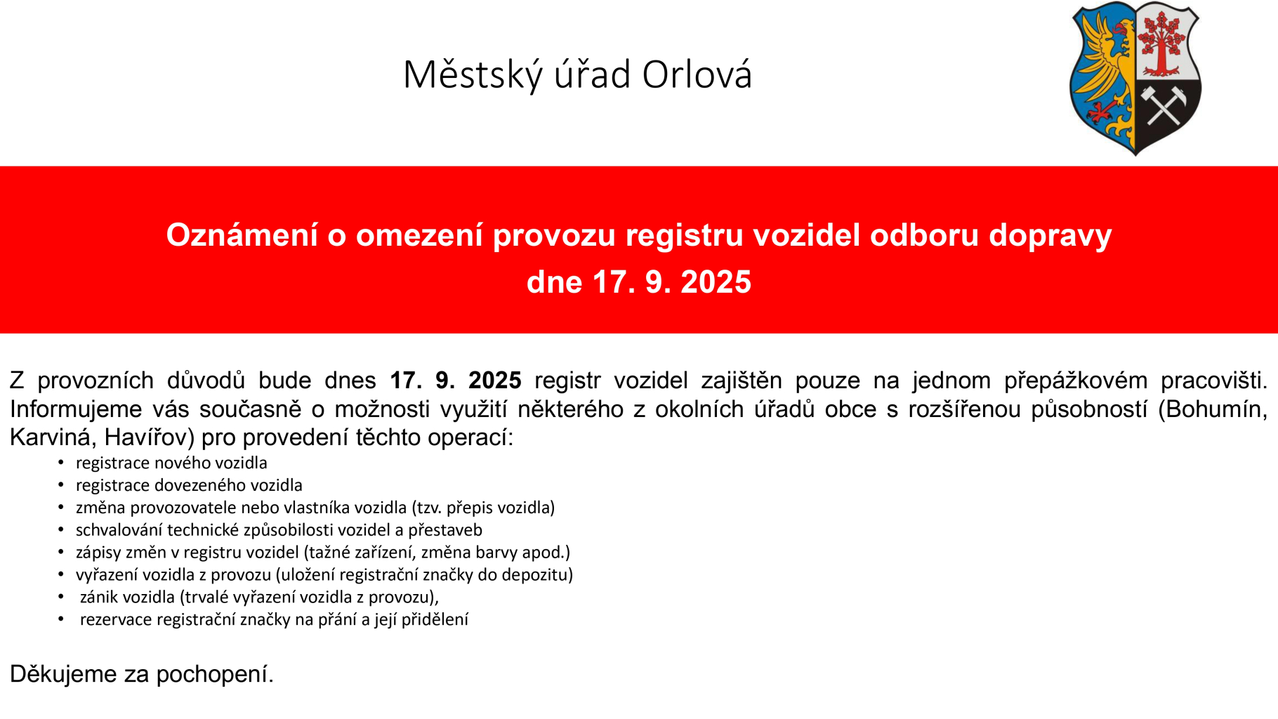 Upozorňujeme občany, že dnes, 17. září 2025, bude registr vozidel odboru dopravy z provozních důvodů zajištěn pouze na jednom přepážkovém pracovišti.