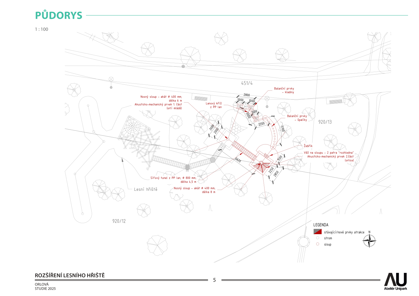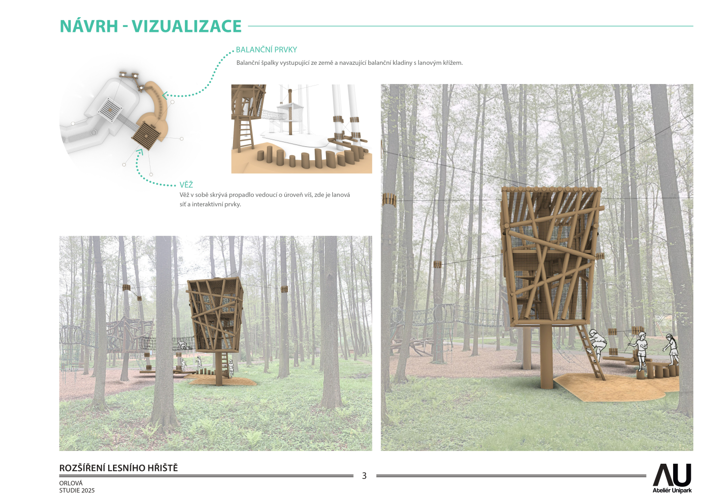 Ze současného orlího hnízda povede nový lanový tunel do dvoupatrové orlí věže. Ve věži bude výlez, kterým se děti dostanou o úroveň výš na lanovou síť. Z lanové sítě budou mít krásný výhled na lesopark. Chybět nebude ani interaktivní herní prvek v podobě orlice s mládětem.