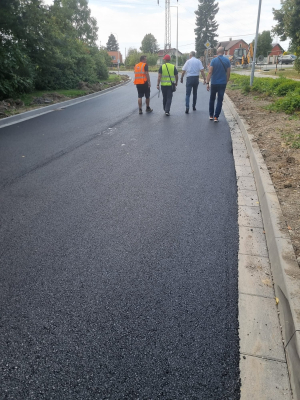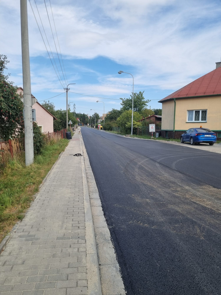 Pořízené fotografie zachycují průběh realizace, kdy byla přímo na místě provedena recyklace za studena, a stav po finální pokládce dvouvrstvého krytu. Nová skladba vozovky je navržena tak, aby lépe odolávala zatížení i povětrnostním vlivům.